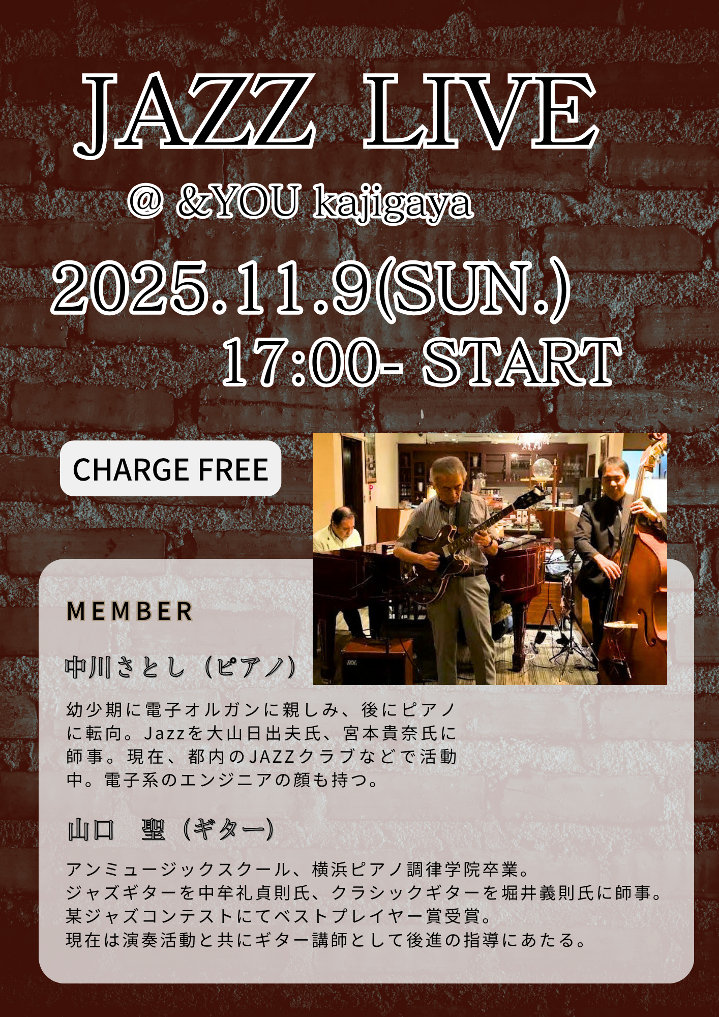 11月24日(月・祝)[ディナータイム] JAZZ LIVE @ &YOU KAJIGAYA