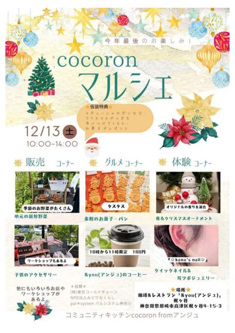 「Cocoron マルシェ」日 時 :2025年12月13日(土) 10:00-14:00 入場無料!場 所:珈琲&レストラン『&you(アンジュ)』梶ヶ谷店 NPO法人みどりなくらしさんとともに、店舗の駐車場スペースとテラス席にて...