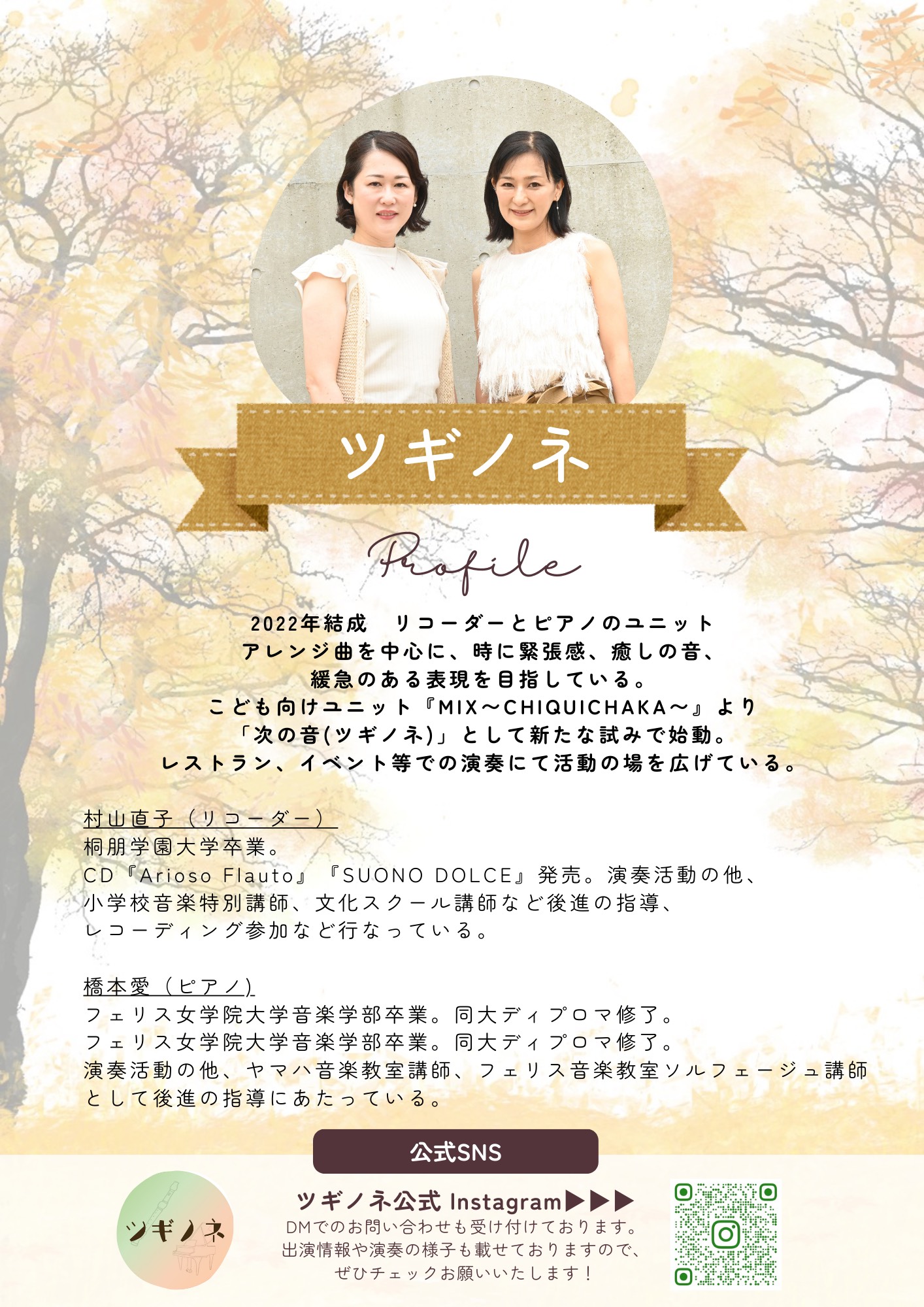10月26日(日)15:00-リコーダーとピアノによるユニットライブ。村山直子:リコーダー【Profile】■2022年結成、ツギノネ(次の音)リコーダーとピアノのユニットアレンジ曲を中心に、時に緊張感、癒しの音、...