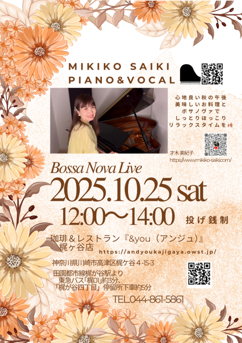 10月25日(土)[ランチタイム] Bossa Nova -Mikiko Saiki- piano&vocal Live
